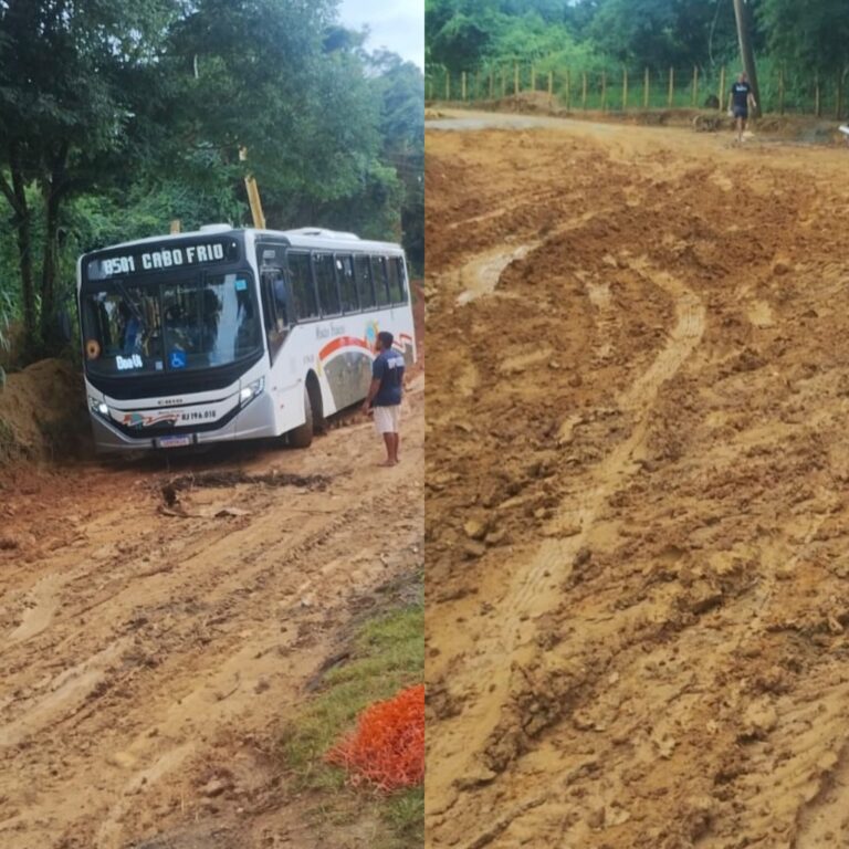 Ônibus fica atolado e moradores denunciam precariedade na Estrada da Fazendinha, em Armação dos Búzios