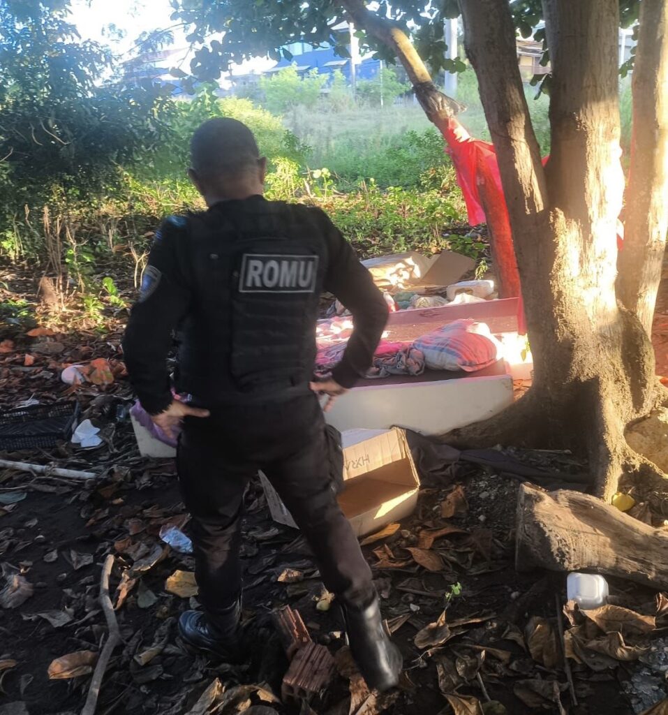 A equipe se deslocou até a Rua João Antônio Rocha, nas proximidades da Rodovia General Bruno Martins, onde encontrou apenas uma estrutura improvisada, sem a presença de ocupantes. No local, havia acúmulo significativo de resíduos.
