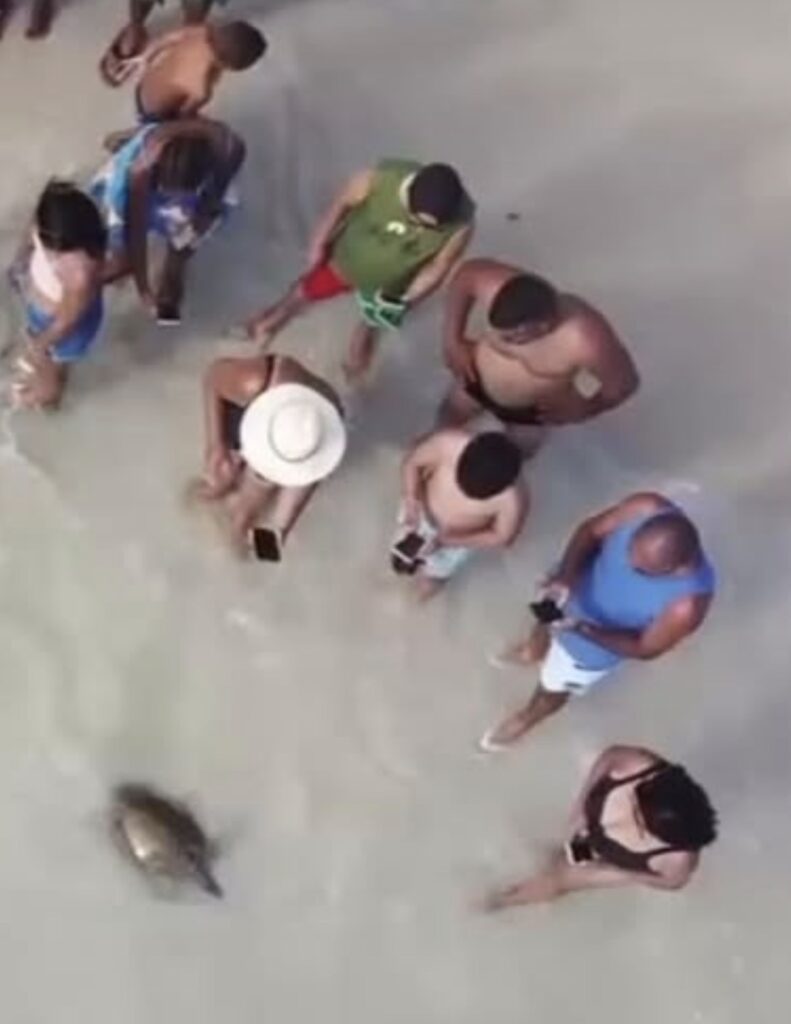 De acordo com o registro, o animal estaria preso a uma rede de pesca artesanal, situação que, segundo relatos locais, costuma mobilizar pescadores para o resgate e devolução segura ao mar. No entanto, no vídeo, o homem aparece segurando a tartaruga enquanto o animal tenta retornar à água.
